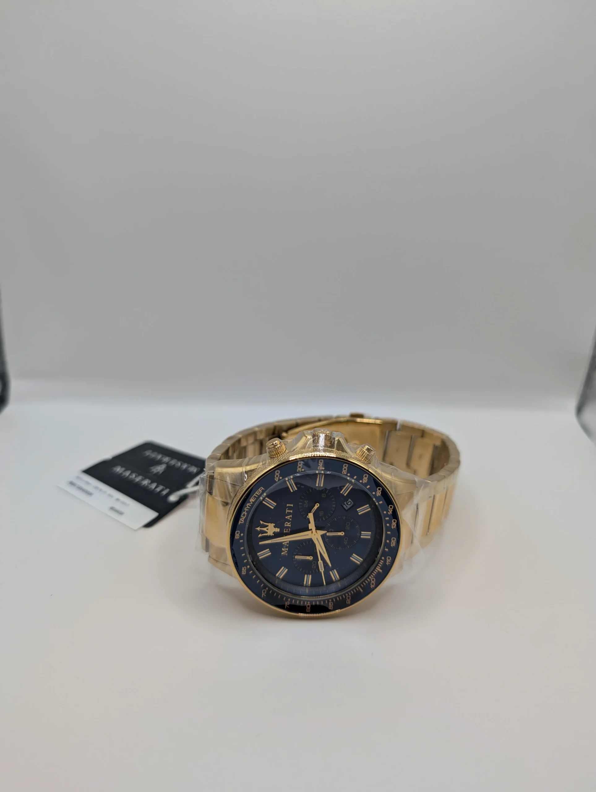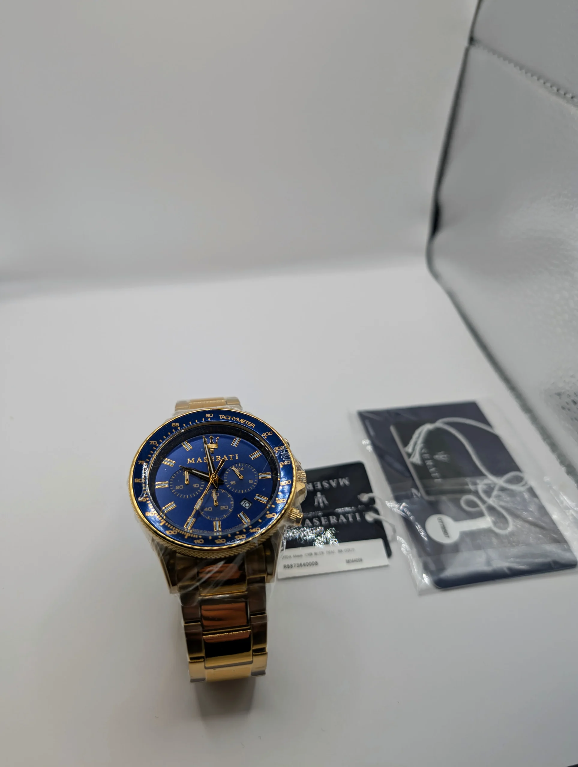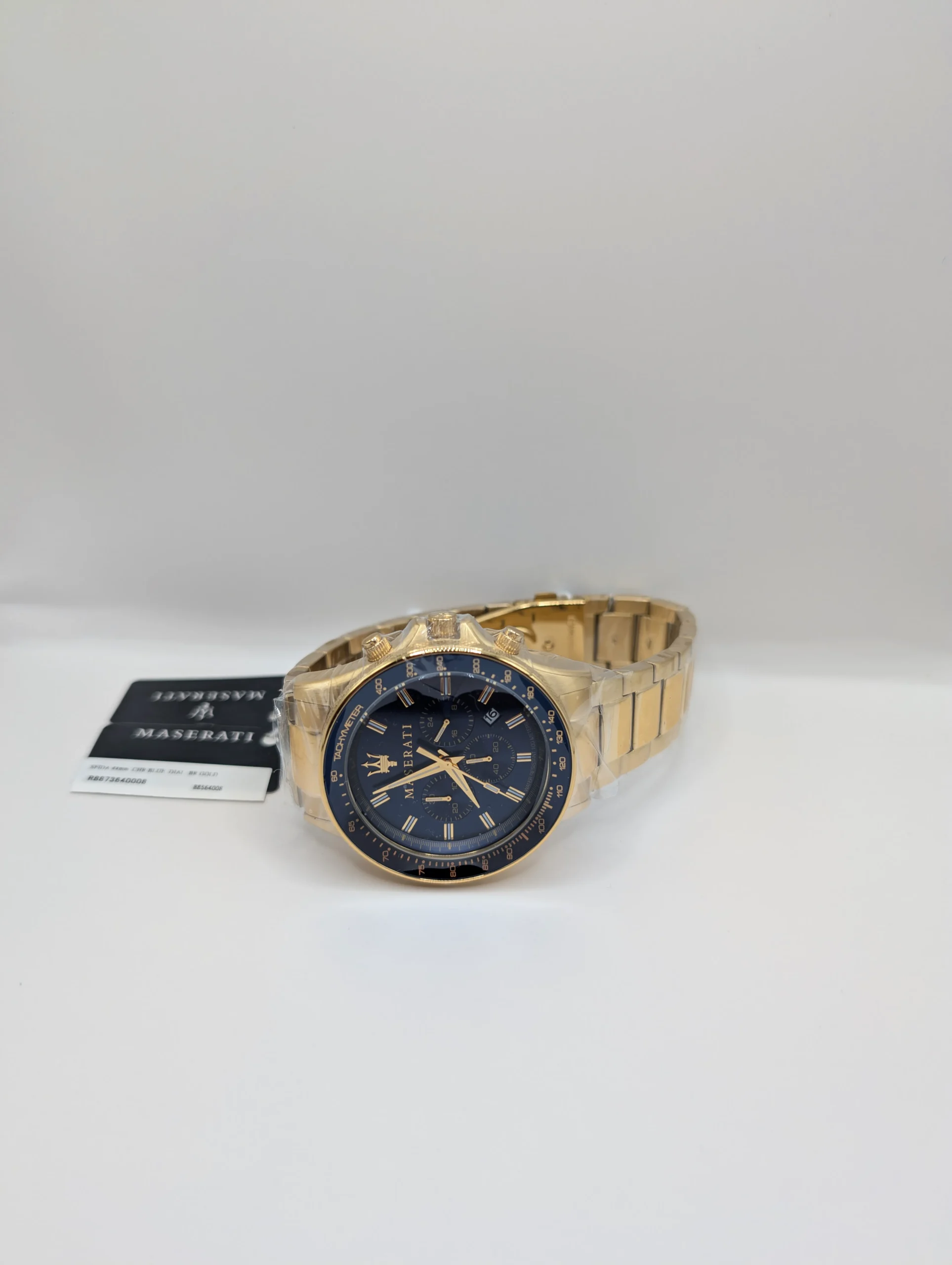 Maserati R8873640008 Sfida to elegancki męski chronograf z kolekcji Sfida, łączący sportowy charakter z luksusem marki samochodowej, idealny do casualowych i biznesowych stylizacji. Okrągła koperta o średnicy 44 mm i grubości 11 mm ze stali nierdzewnej w złotym PVD (nickel free, antyalergiczna), zakręcany dekiel, waga 178-200 g. Niebieska tarcza z szlifem słonecznym, luminescencyjnymi indeksami/wskazówkami, subtarczami chronografu (czas dobowy 24h, stoper), tachymetrem i datownikiem dnia miesiąca zapewnia czytelność.