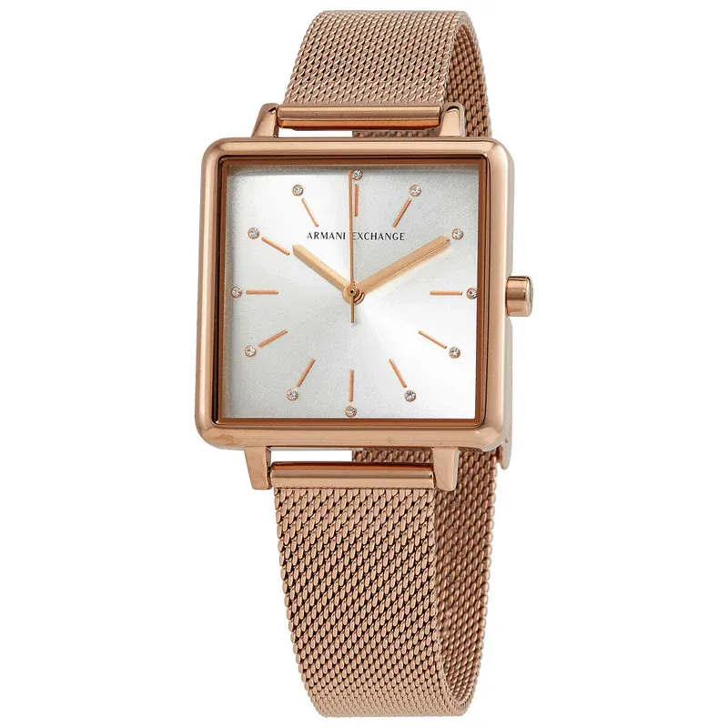 Armani Exchange AX5802 – Kwadratowa Różowozłota Damska Elegancja ze Srebrną Tarczą z Cyrkoniami i Różowozłotą Bransoletą Mesh