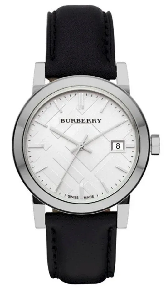 Burberry BU9106 The City – Srebrna Check Tarcza i Czarny Skórzany Pasek – Dla Kobiety Która Zna Przemoc Kontrastu