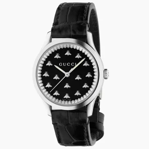 Gucci G-Timeless YA1265055 to wyraz bezpretensjonalnego luksusu i minimalistycznej elegancji. Czarna tarcza z wysoko polerowaną stalową koperta w połączeniu z czarnym skórzanym paskiem krokodylim tworzy klasyczną, dyskretną całość. Ten elegancki model łączy niezawodną funkcjonalność ze wspaniałym wykonaniem i designem, idealny dla osób ceniących ponadczasowy styl i dyskretny, niezauważalny luksus.