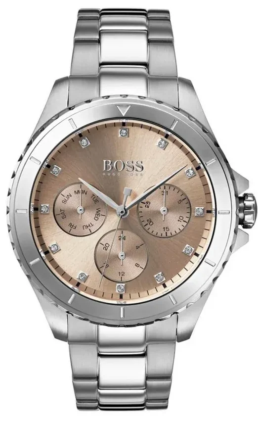 Hugo Boss 1502444 Premiere to damski zegarek na stalowej bransolecie, utrzymany w chłodnej srebrnej kolorystyce z kontrastującą tarczą w odcieniu różowego złota. Okrągła koperta 38 mm nadaje mu bardziej zdecydowany wygląd niż w delikatniejszych modelach biżuteryjnych, ale całość nadal zachowuje elegancki charakter. To dobry wybór dla osób, które chcą połączyć klasyczną stalową formę z cieplejszym, bardziej dekoracyjnym akcentem na tarczy.