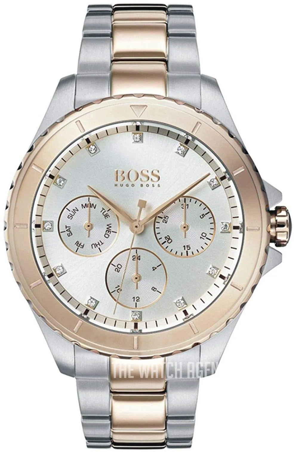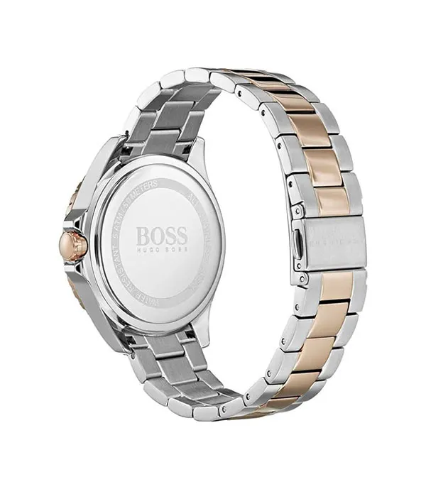 Hugo Boss 1502446 to damski zegarek na stalowej bransolecie w wykończeniu srebrno-różowo-złotym. Koperta 38 mm, srebrna tarcza i kryształowe indeksy tworzą elegancką całość o bardziej biżuteryjnym charakterze, ale bez przesady. To model, który dobrze łączy codzienną użyteczność z bardziej dopracowanym, kobiecym wykończeniem.