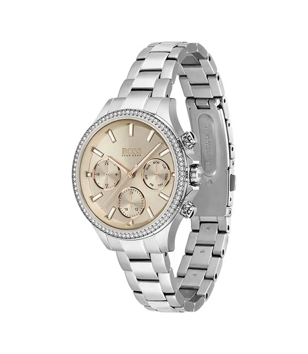 Hugo Boss 1502565 Hera to damski zegarek na srebrnej stalowej bransolecie, utrzymany w prostej, uporządkowanej stylistyce. Złota tarcza przełamuje chłodniejsze wykończenie koperty i bransolety, dzięki czemu model wygląda bardziej elegancko i biżuteryjnie, ale nadal zachowuje minimalistyczny charakter. To dobra propozycja dla osób, które szukają kobiecego zegarka Hugo Boss z klasyczną, prostą tarczą.