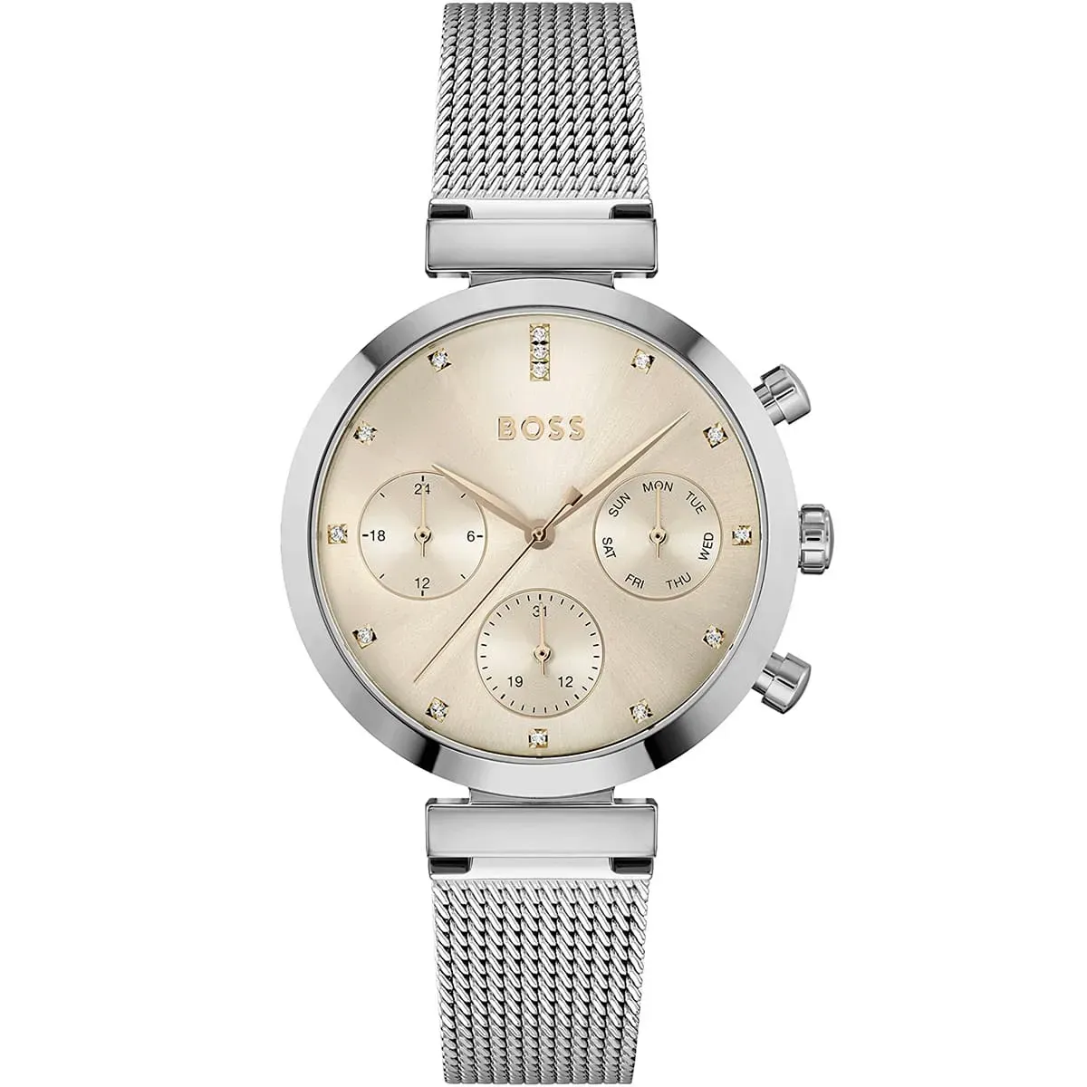 Hugo Boss 1502625 Flawless to damski zegarek na srebrnej bransolecie mesh z tarczą w odcieniu różowego złota. Takie połączenie daje lżejszy, bardziej biżuteryjny efekt niż klasyczna stalowa bransoleta ogniwowa, ale nadal zachowuje nowoczesny i uporządkowany charakter. Koperta 36 mm dobrze wpisuje się w kobiece proporcje i sprawia, że model pozostaje wygodny w codziennym noszeniu.