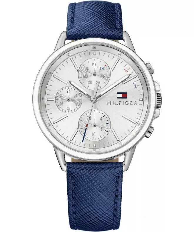 Tommy Hilfiger 1781791 Carly to damski zegarek, w którym szara tarcza została zestawiona ze srebrną kopertą i granatowym paskiem ze skóry naturalnej. Takie zestawienie łączy chłodną, elegancką kolorystykę z bardziej codziennym charakterem paska, dzięki czemu model dobrze odnajduje się w wielu stylizacjach.