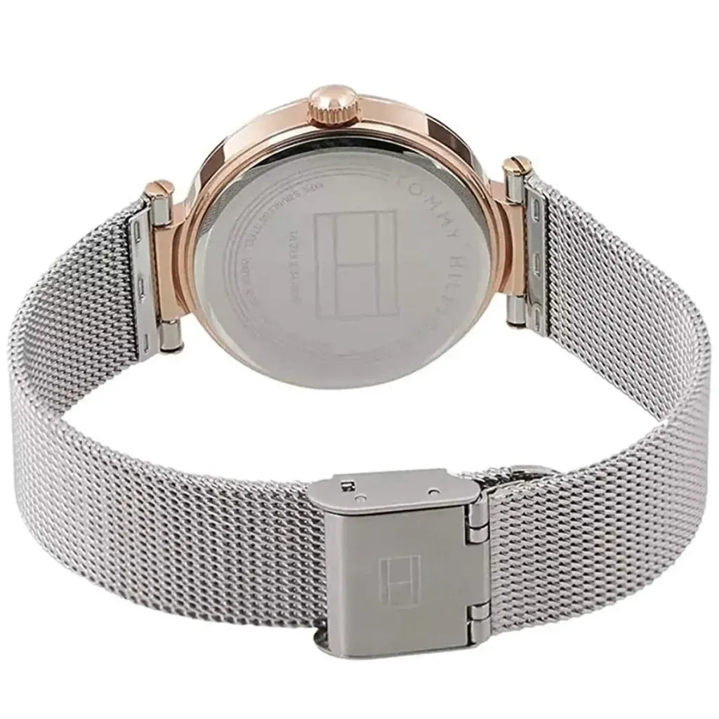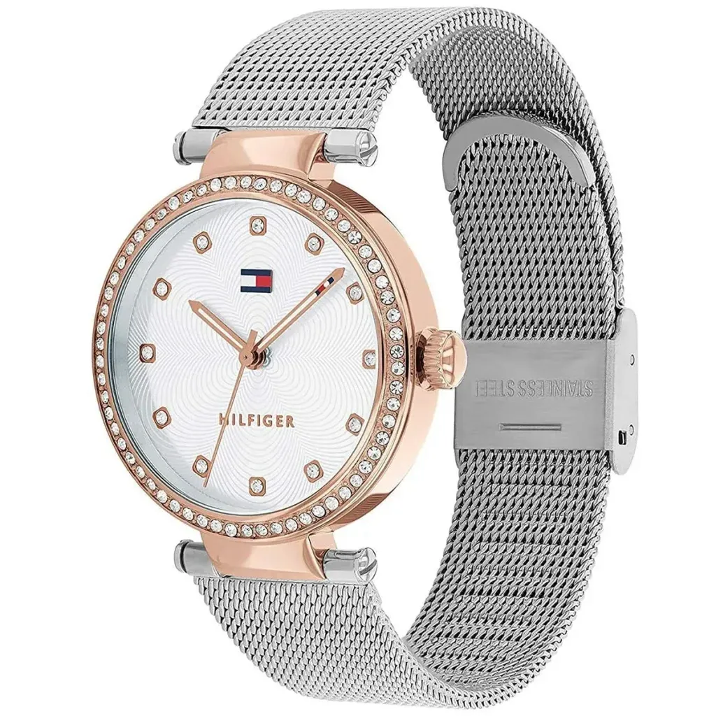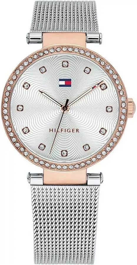 Tommy Hilfiger 1781863 Lynn to damski zegarek, w którym koperta w kolorze różowego złota została połączona ze srebrną bransoletą typu mesh i srebrną tarczą. Taki kontrast nadaje modelowi elegancki, biżuteryjny charakter, a jednocześnie sprawia, że zegarek pozostaje uniwersalny i łatwy do zestawienia z codzienną garderobą.