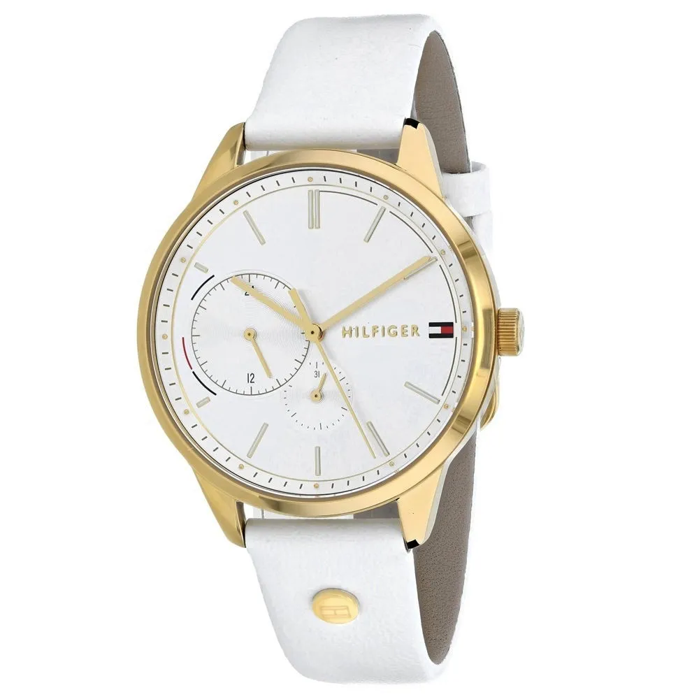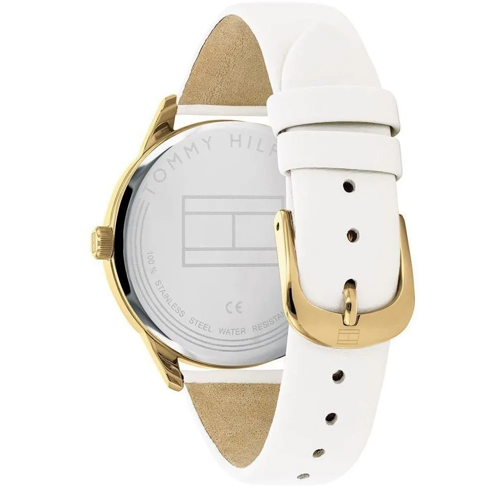 Tommy Hilfiger 1782018 to damski zegarek utrzymany w jasnej, eleganckiej stylistyce, w której biały skórzany pasek łączy się ze złotą kopertą i srebrną tarczą. Takie zestawienie sprawia, że model prezentuje się lekko i kobieco, a przy tym łatwo dopasować go zarówno do codziennych stylizacji, jak i do bardziej dopracowanych zestawów na wyjątkowe okazje.