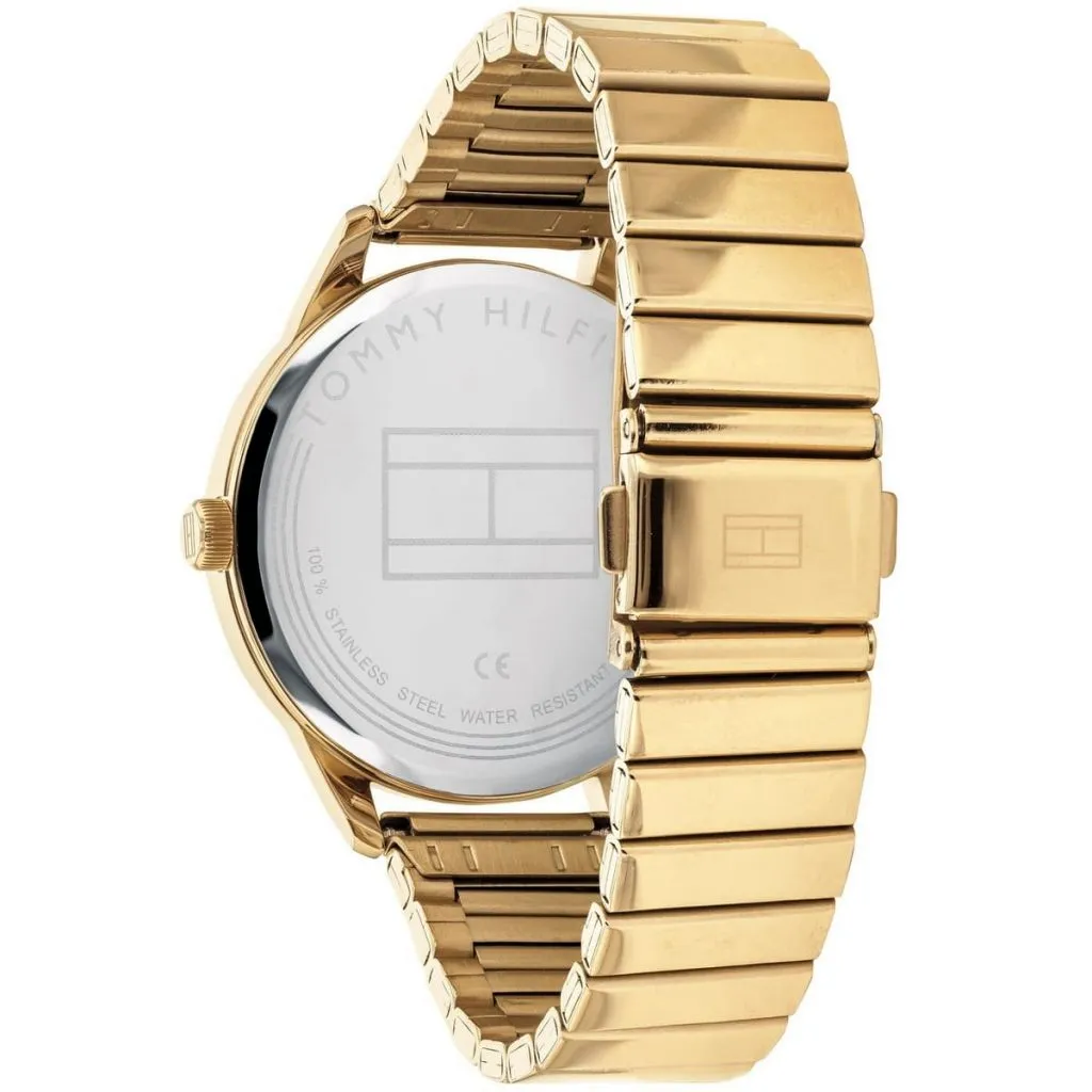 Tommy Hilfiger 1782019 Brooke to damski zegarek, który łączy złotą kopertę i bransoletę ze stali szlachetnej z czarną tarczą o mocnym, kontrastowym wyglądzie. Dzięki temu model prezentuje się elegancko, ale jednocześnie ma bardziej zdecydowany charakter niż klasyczne jasne zegarki. Koperta 38 mm dobrze wpisuje się w aktualne proporcje modowych modeli damskich.