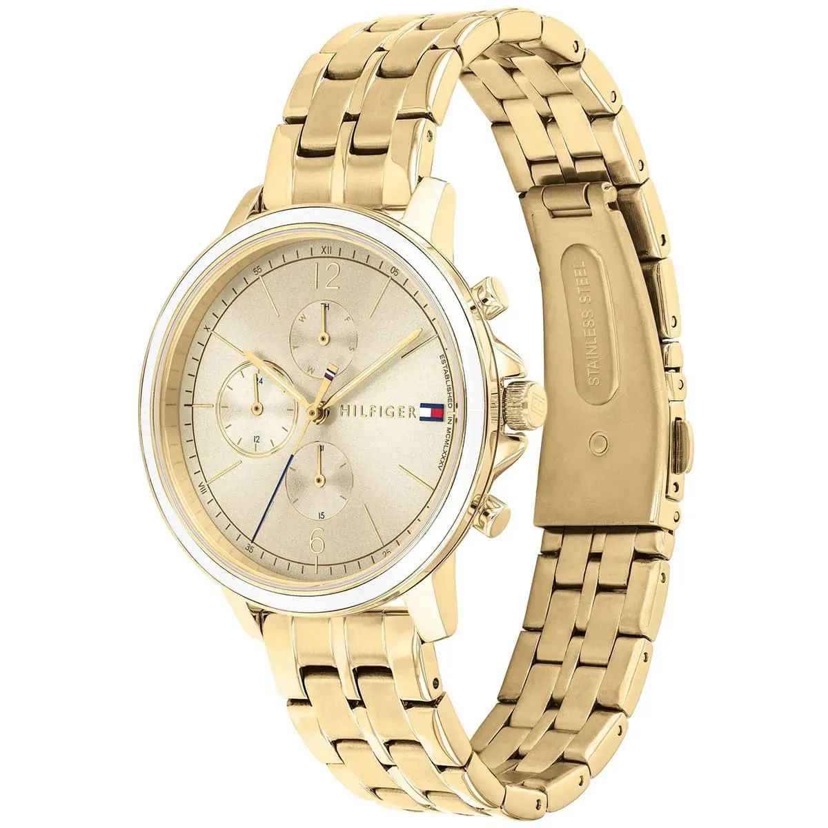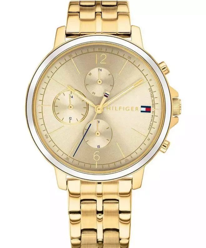 Zegarek został wyposażony w mechanizm kwarcowy, szkło mineralne oraz multifunkcyjną tarczę z datownikiem, wskazaniem dnia tygodnia i czasu 24-godzinnego. Koperta o szerokości 38 mm zachowuje wygodne proporcje, a wodoszczelność 30 metrów zwiększa praktyczność użytkowania. To dobry wybór dla osób, które szukają damskiego zegarka Tommy Hilfiger na złotej bransolecie, w jednolitym kolorystycznie wydaniu.