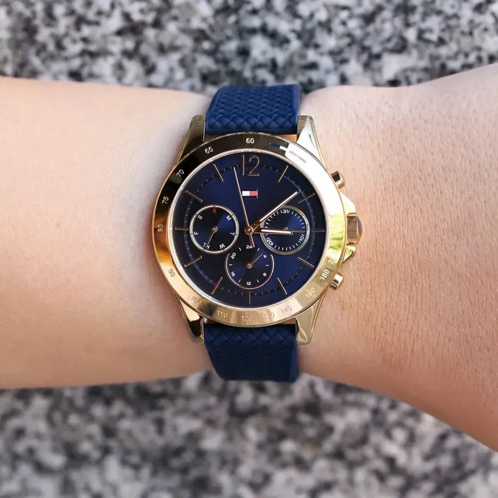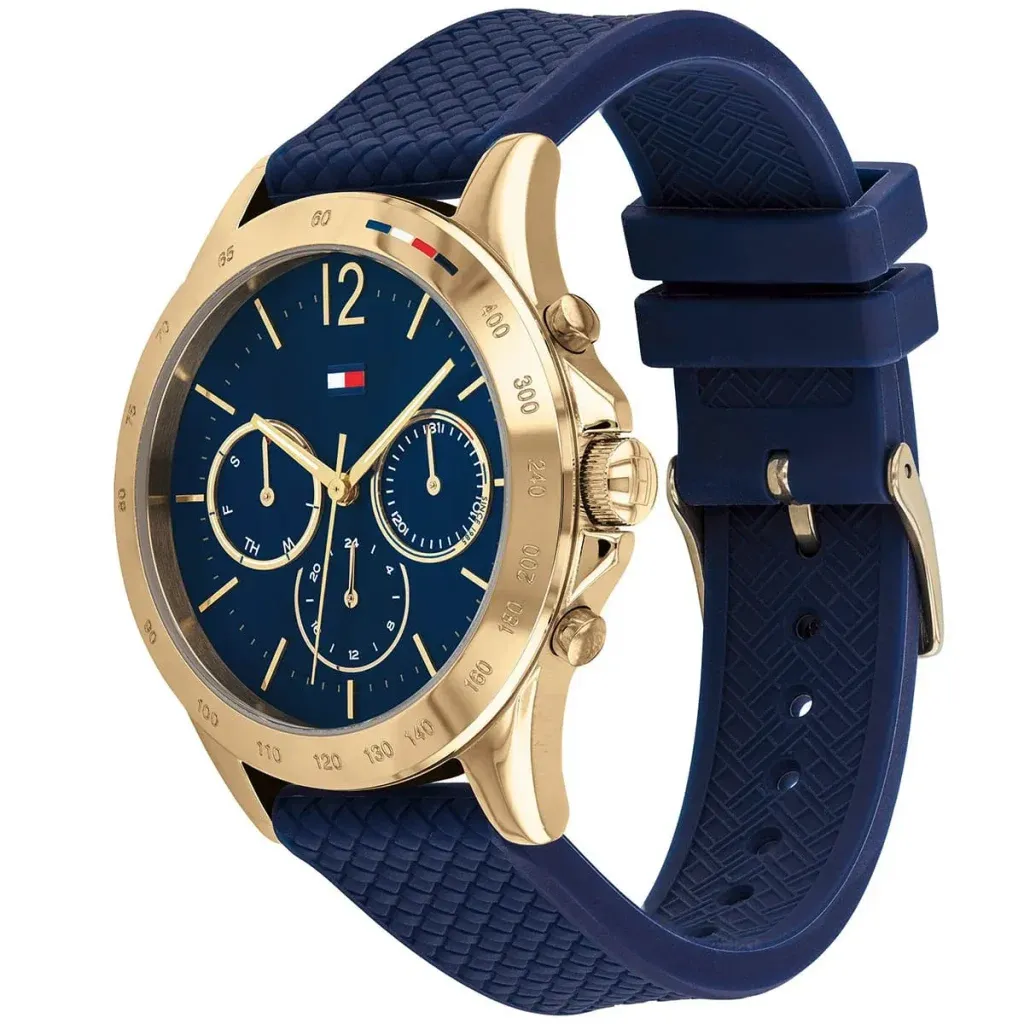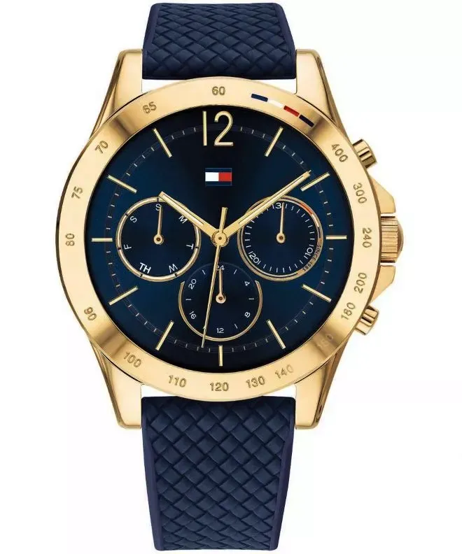 Tommy Hilfiger 1782198 Haven to damski zegarek, który łączy granatową tarczę z niebieskim paskiem silikonowym i złotą kopertą. Taki układ kolorystyczny nadaje modelowi bardziej sportowy, nowoczesny charakter, a jednocześnie zachowuje modowy styl charakterystyczny dla marki Tommy Hilfiger.