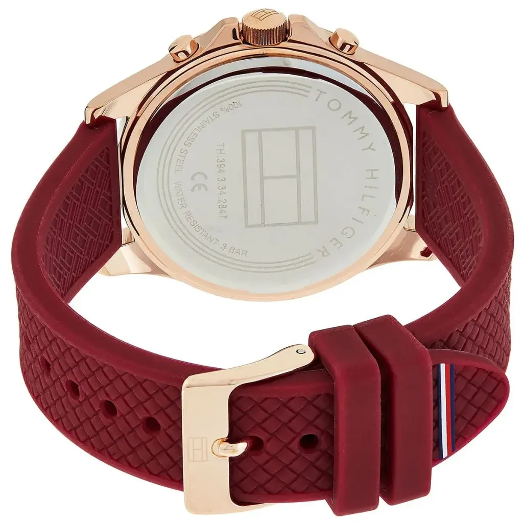 Tommy Hilfiger 1782200 Haven to damski zegarek, który łączy białą tarczę z bordowo-czerwonym paskiem silikonowym oraz kopertą w odcieniu różowego złota. Takie zestawienie nadaje modelowi świeży, nowoczesny wygląd i sprawia, że dobrze wpisuje się w codzienne stylizacje o bardziej sportowym lub modowym charakterze.