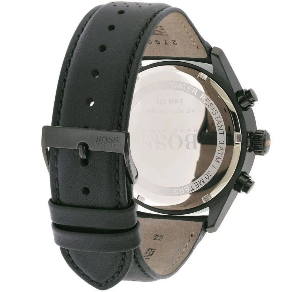 Hugo Boss 1513550 Grand Prix to męski zegarek na czarnym skórzanym pasku z kopertą 44 mm i ciemną tarczą. Połączenie czarnej koperty z kontrastowymi detalami na tarczy nadaje mu bardziej dynamiczny, sportowy charakter niż klasyczne modele o prostszej kolorystyce.