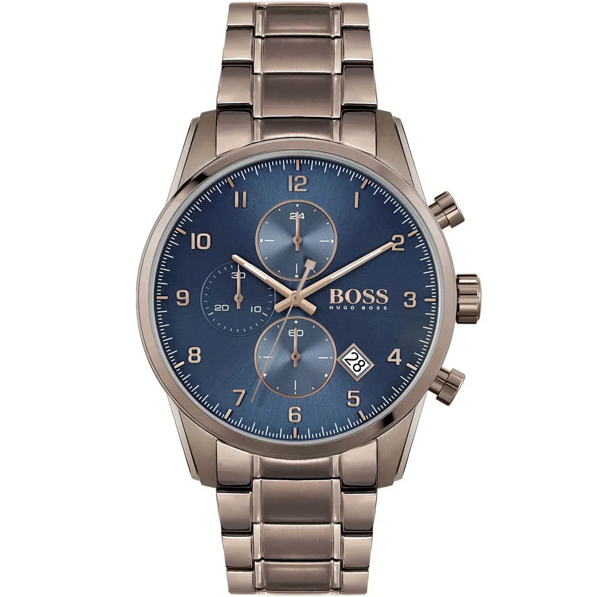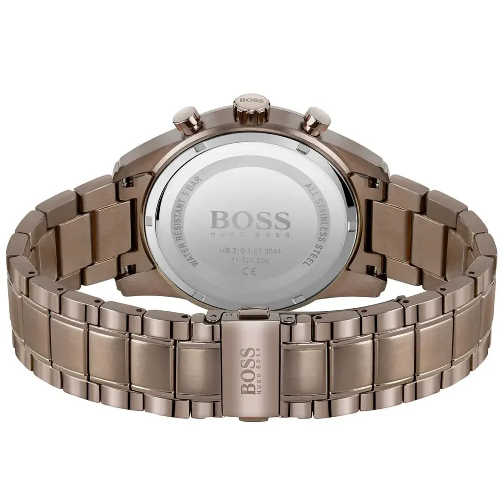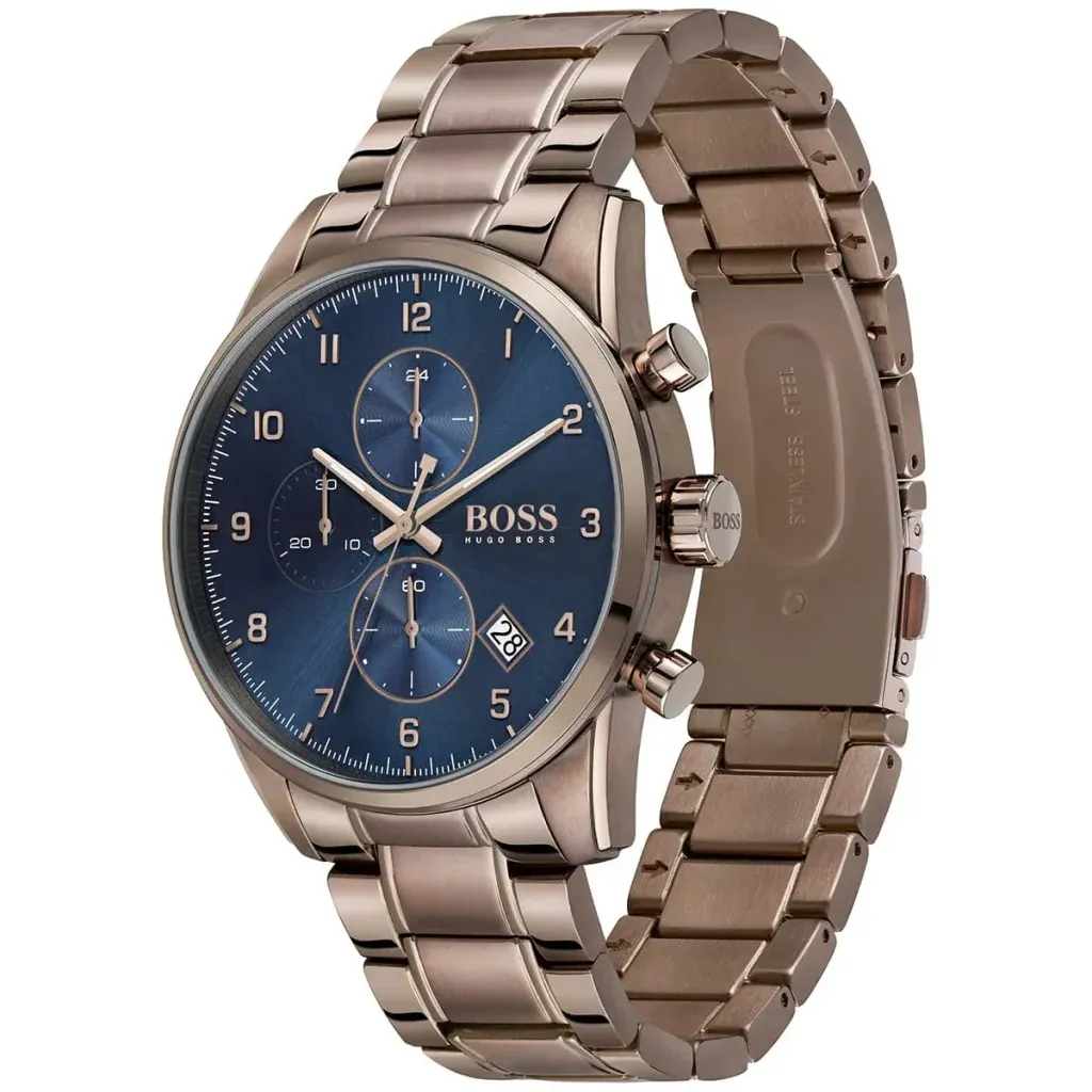 Hugo Boss 1513788 Skymaster to męski zegarek na stalowej bransolecie w brązowym odcieniu z kopertą 44 mm i granatową tarczą. Oryginalne zestawienie kolorów wyróżnia go na tle klasycznych modeli w stali i nadaje mu bardziej wyrazisty charakter.