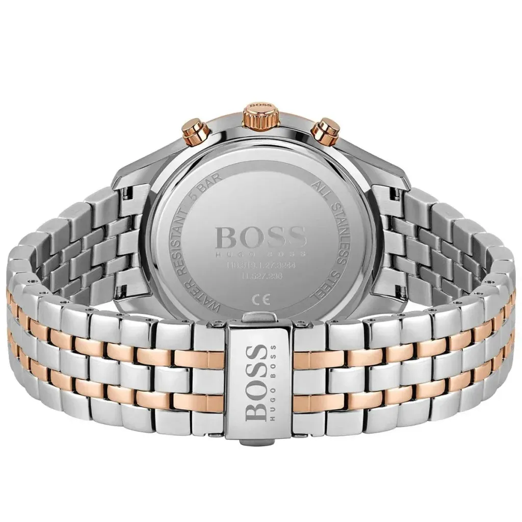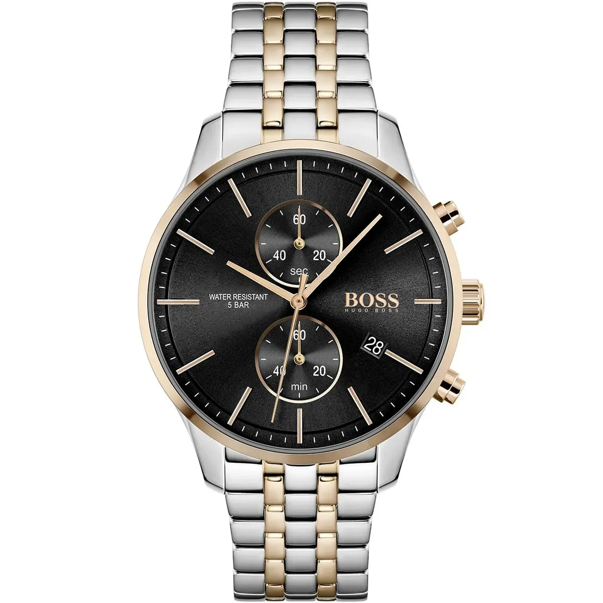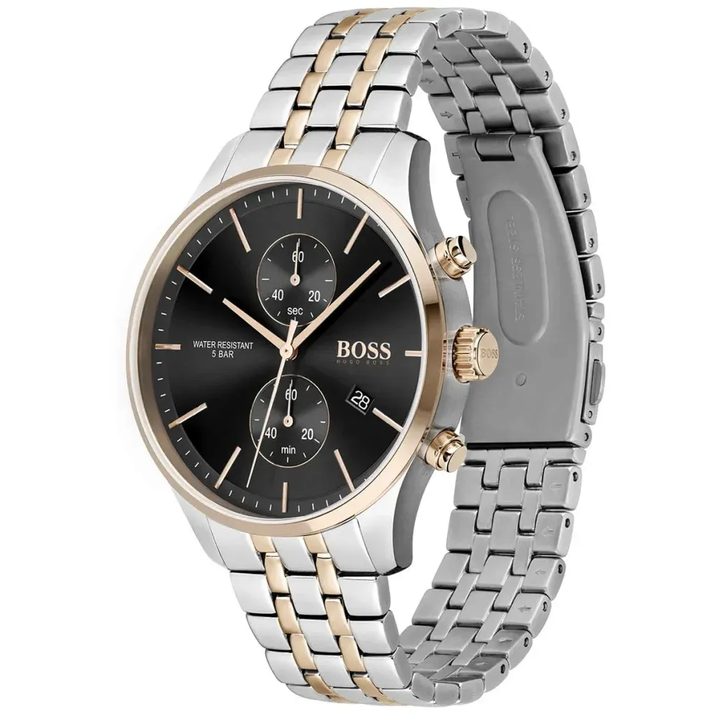 Hugo Boss 1513840 Associate to męski zegarek na dwukolorowej bransolecie z kopertą 42 mm i czarną tarczą. Kontrast ciemnej tarczy z cieplejszym wykończeniem koperty i elementów bransolety sprawia, że model wygląda bardziej elegancko i wyraziście niż klasyczne warianty stalowe.