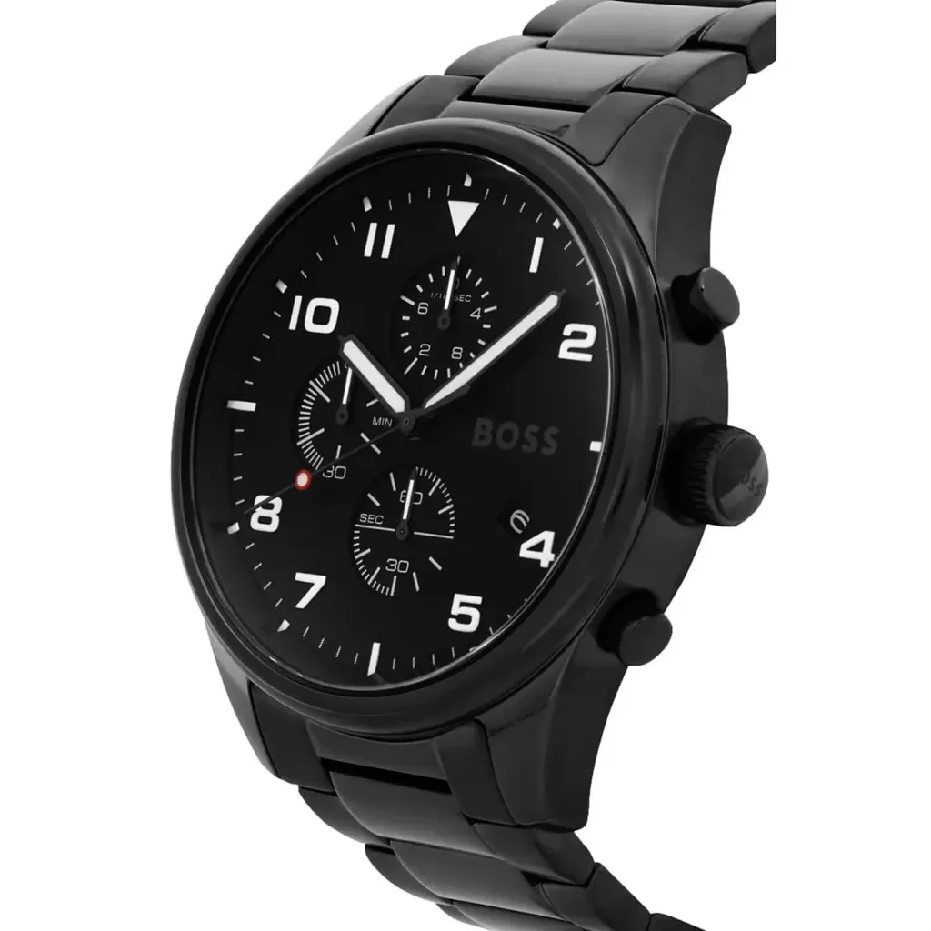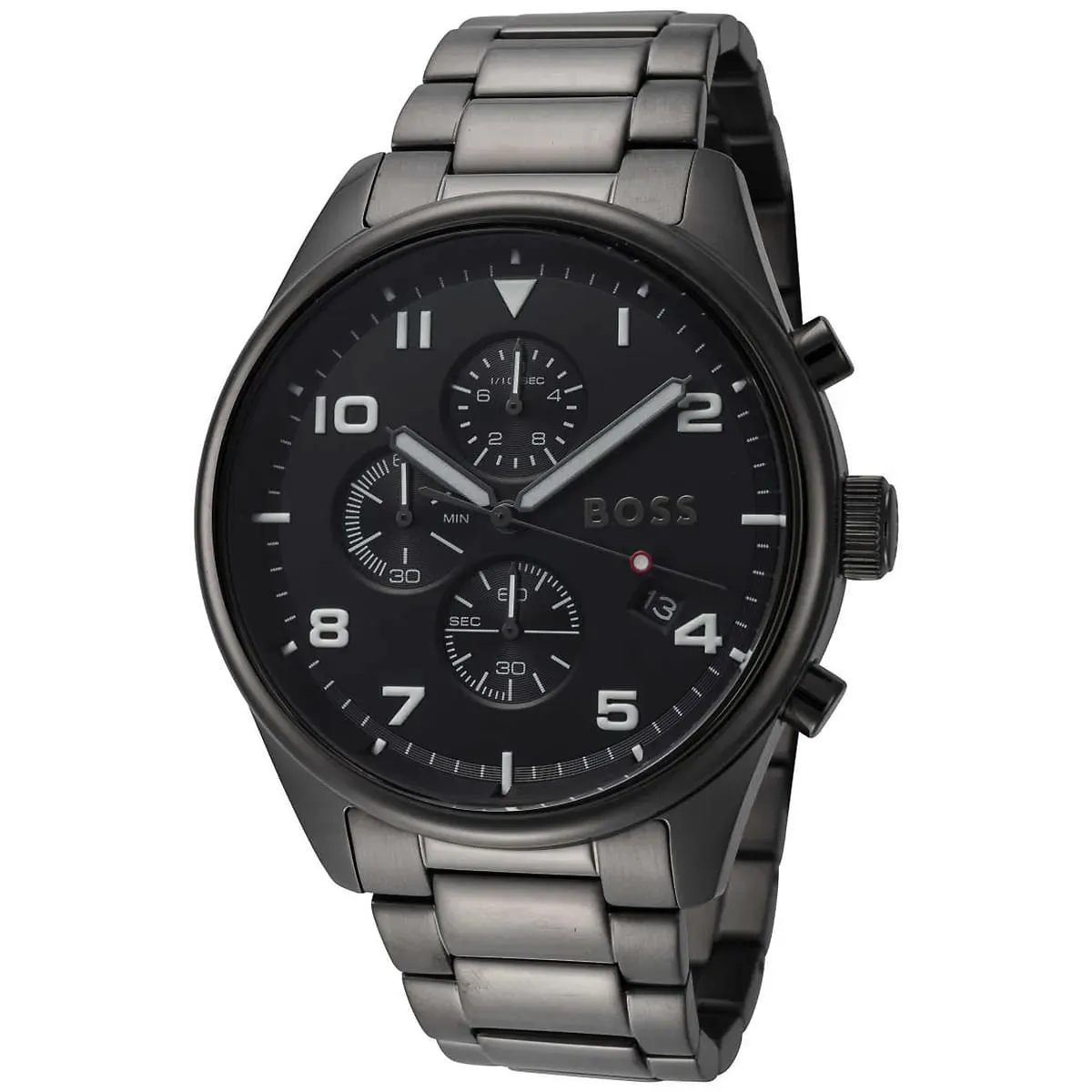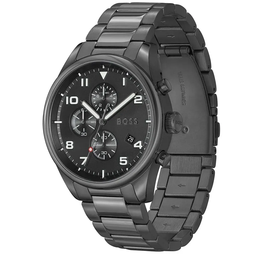 Hugo Boss 1513991 View to męski zegarek na grafitowej stalowej bransolecie z kopertą 44 mm i czarną tarczą. Ciemniejsza kolorystyka sprawia, że model wygląda nowocześnie i bardziej zdecydowanie niż klasyczne warianty w jasnej stali, a jednocześnie nadal pozostaje łatwy do dopasowania do codziennych stylizacji.