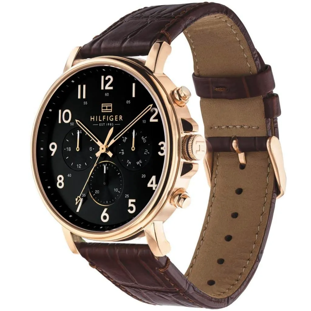 Tommy Hilfiger 1710379 Daniel to męski zegarek, w którym czarna tarcza została zestawiona z brązowym paskiem ze skóry naturalnej i kopertą w kolorze różowego złota. Takie połączenie sprawia, że model prezentuje się elegancko, ale nie traci codziennego charakteru.