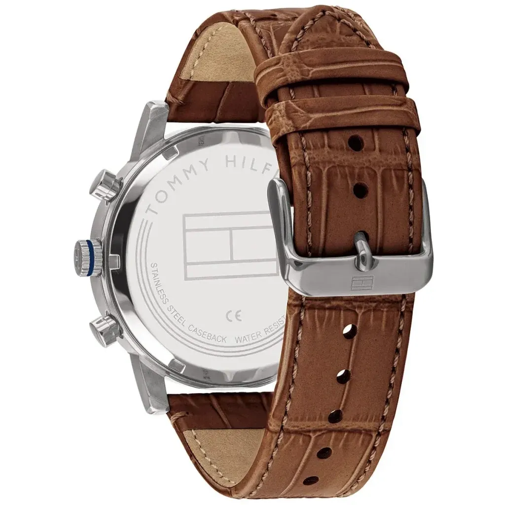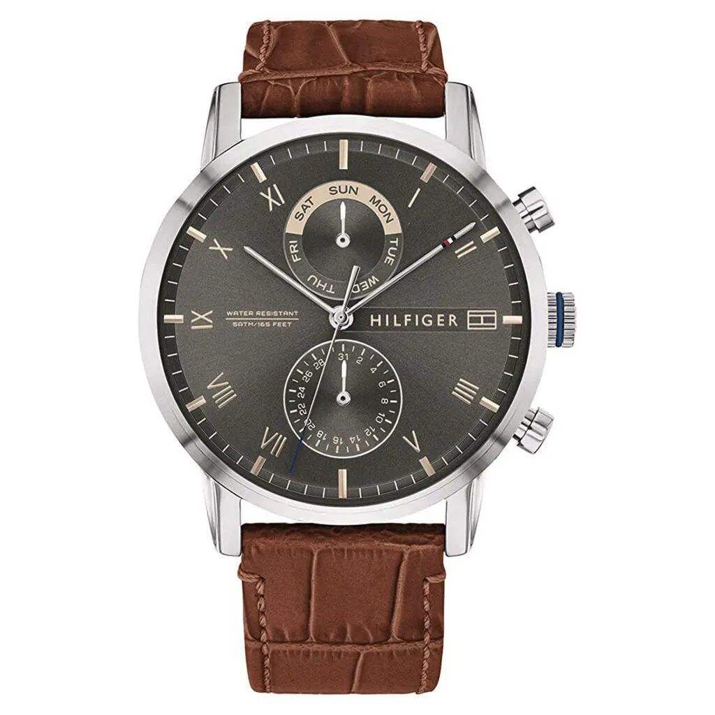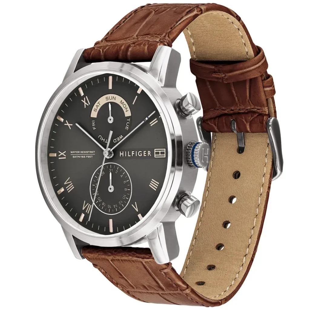 Tommy Hilfiger 1710398 Kane to model, który dobrze łączy klasyczne proporcje z nowoczesnym wykończeniem. Szara tarcza zestawiona z brązowym skórzanym paskiem daje spokojny, dojrzały efekt, dzięki czemu zegarek dobrze odnajduje się zarówno przy codziennych stylizacjach, jak i przy bardziej uporządkowanym stroju.