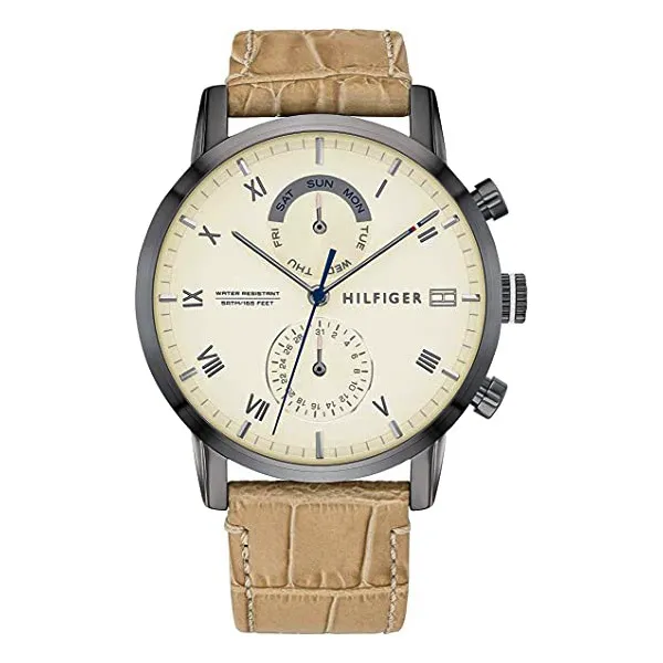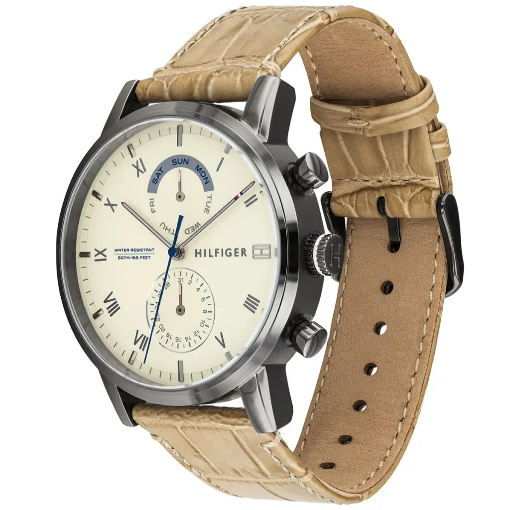 Tommy Hilfiger 1710399 Kane wyróżnia się jasną, beżową kolorystyką, która rzadziej pojawia się w zegarkach męskich i dzięki temu przyciąga uwagę bardziej nietypowym charakterem. Beżowa tarcza i pasek tworzą spójną, ciepłą całość, która dobrze pasuje do stylu casual oraz smart casual.