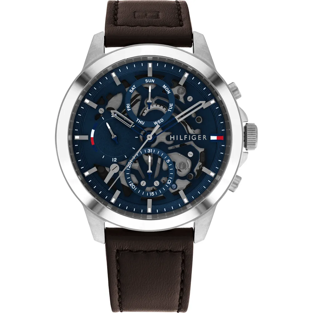 Model został wyposażony w mechanizm kwarcowy, szkło mineralne i wodoszczelność 5 ATM. Rozbudowana tarcza oferuje wskazania dnia miesiąca, dnia tygodnia i czasu 24-godzinnego, co zwiększa funkcjonalność podczas codziennego użytkowania. To propozycja dla osób, które szukają zegarka Tommy Hilfiger na skórzanym pasku, z granatową tarczą i bardziej dekoracyjnym wykończeniem.