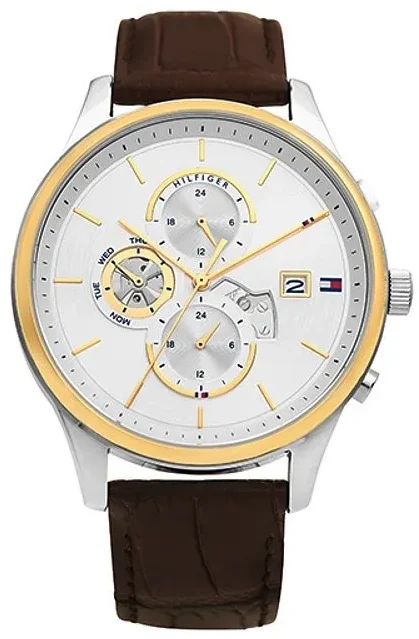 Tommy Hilfiger 1710501 Weston to jeden z bardziej klasycznych modeli w tej paczce. Srebrna tarcza, brązowy skórzany pasek i koperta w tonacji srebra z delikatnym złotym akcentem tworzą elegancką, dobrze wyważoną kompozycję, która pasuje zarówno do codziennych stylizacji, jak i do bardziej formalnego stroju.
