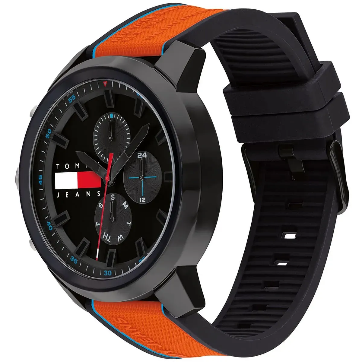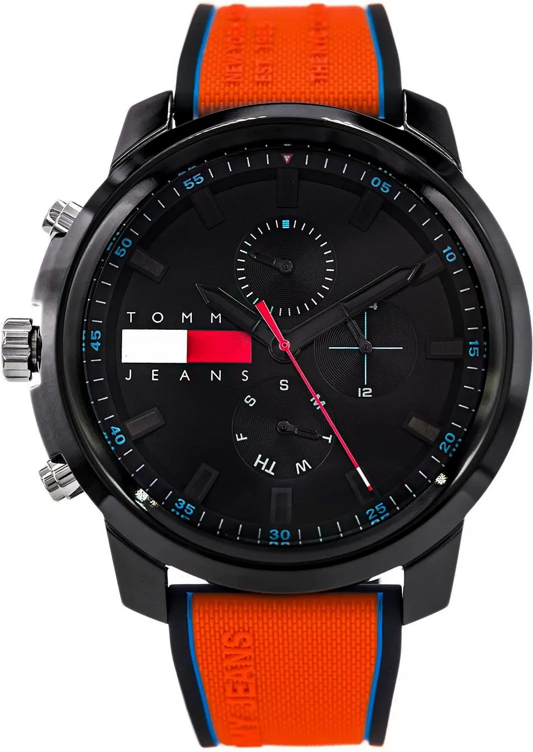 Model wyposażono w mechanizm kwarcowy, szkło mineralne oraz wodoszczelność 5 ATM. Funkcjonalna tarcza oferuje wskazania dnia miesiąca, dnia tygodnia i czasu 24-godzinnego, co zwiększa wygodę codziennego użytkowania. To propozycja dla osób, które szukają dużego zegarka Tommy Hilfiger na silikonowym pasku, z ciemną tarczą i mocnym kolorystycznym akcentem.