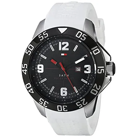 Tommy Hilfiger 1790986 to męski zegarek o dynamicznej, sportowej stylistyce, w której czarna tarcza i duża koperta zostały zestawione z kontrastowym białym paskiem z tworzywa. Takie połączenie sprawia, że model mocno wyróżnia się na nadgarstku i dobrze pasuje do luźniejszych, codziennych stylizacji.
