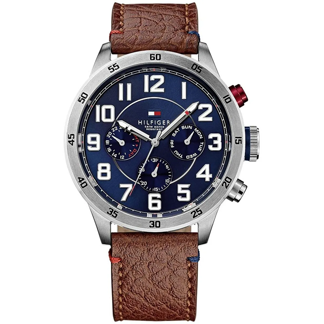 Tommy Hilfiger 1791066 to męski zegarek utrzymany w bardziej klasycznej stylistyce, w której granatowa tarcza została połączona z brązowym paskiem ze skóry naturalnej. Takie zestawienie kolorystyczne dobrze wpisuje się w styl casual i półformalny, a koperta 40 mm sprawia, że model zachowuje uniwersalne proporcje.