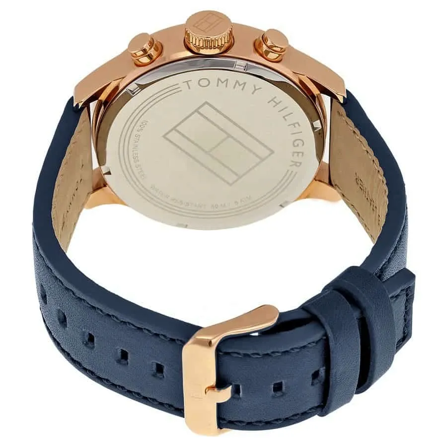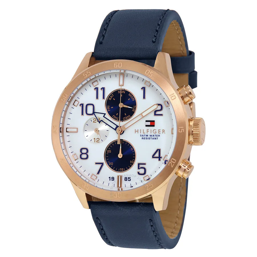 Tommy Hilfiger 1791139 to męski zegarek utrzymany w eleganckiej, klasycznej stylistyce. Biała tarcza została zestawiona z granatowym paskiem ze skóry naturalnej, dzięki czemu model prezentuje się stylowo, schludnie i bardzo uniwersalnie.
