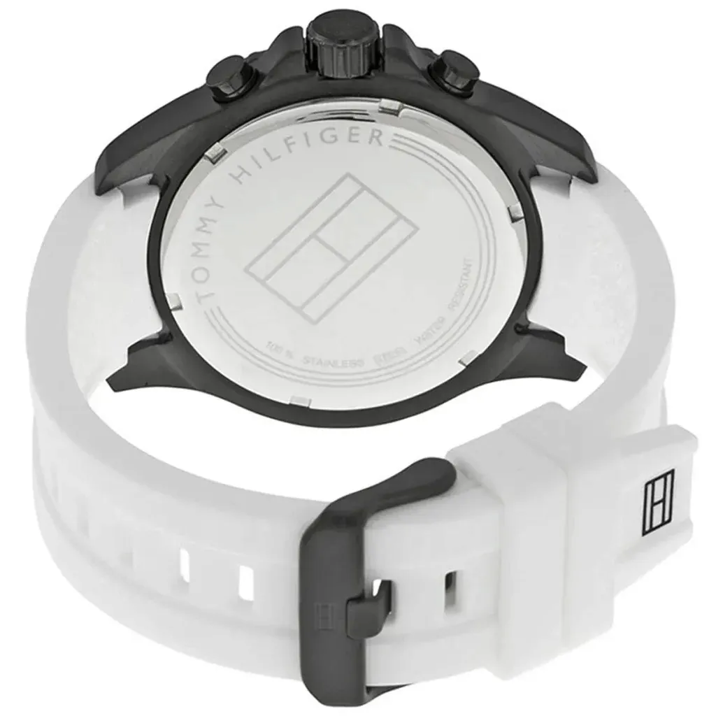 Tommy Hilfiger 1791146 Nolan to męski zegarek o kontrastowej, sportowej stylistyce, w której biała tarcza i biały pasek z tworzywa zostały zestawione z czarną kopertą. Taki układ kolorystyczny nadaje modelowi bardzo nowoczesny wygląd i sprawia, że mocno wyróżnia się na nadgarstku. Koperta 46 mm dobrze podkreśla jego zdecydowany charakter.