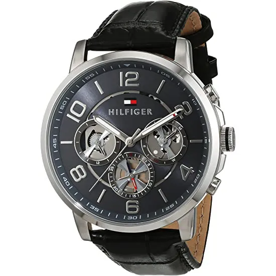 Model wyposażono w mechanizm kwarcowy, szkło mineralne i wodoszczelność 5 ATM. Koperta 44 mm zapewnia dobrze wyważone proporcje, a skórzany pasek zwiększa wygodę codziennego użytkowania. To propozycja dla osób, które szukają zegarka Tommy Hilfiger na pasku, z ciemną kolorystyką i nieco bardziej nietypowym wzornictwem.