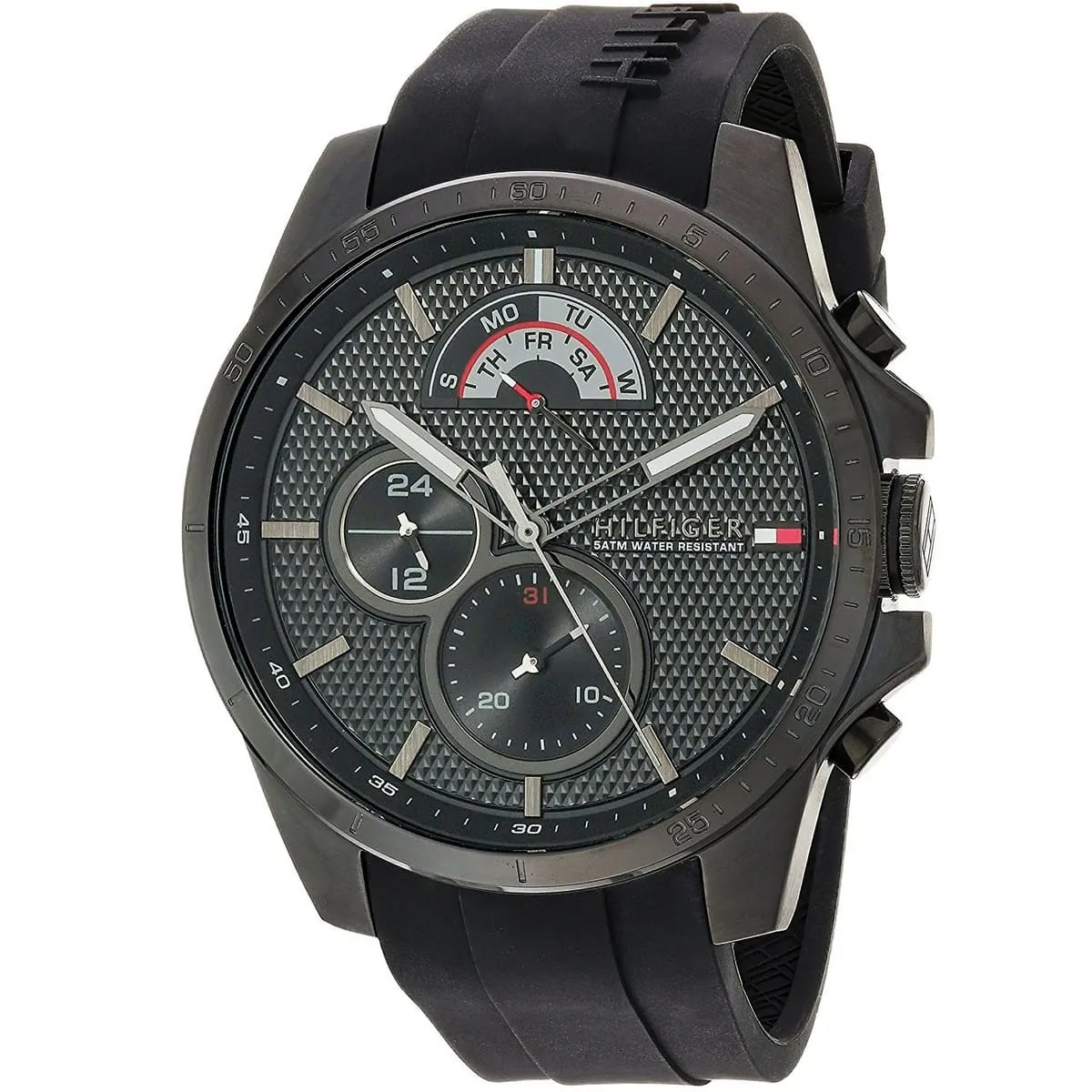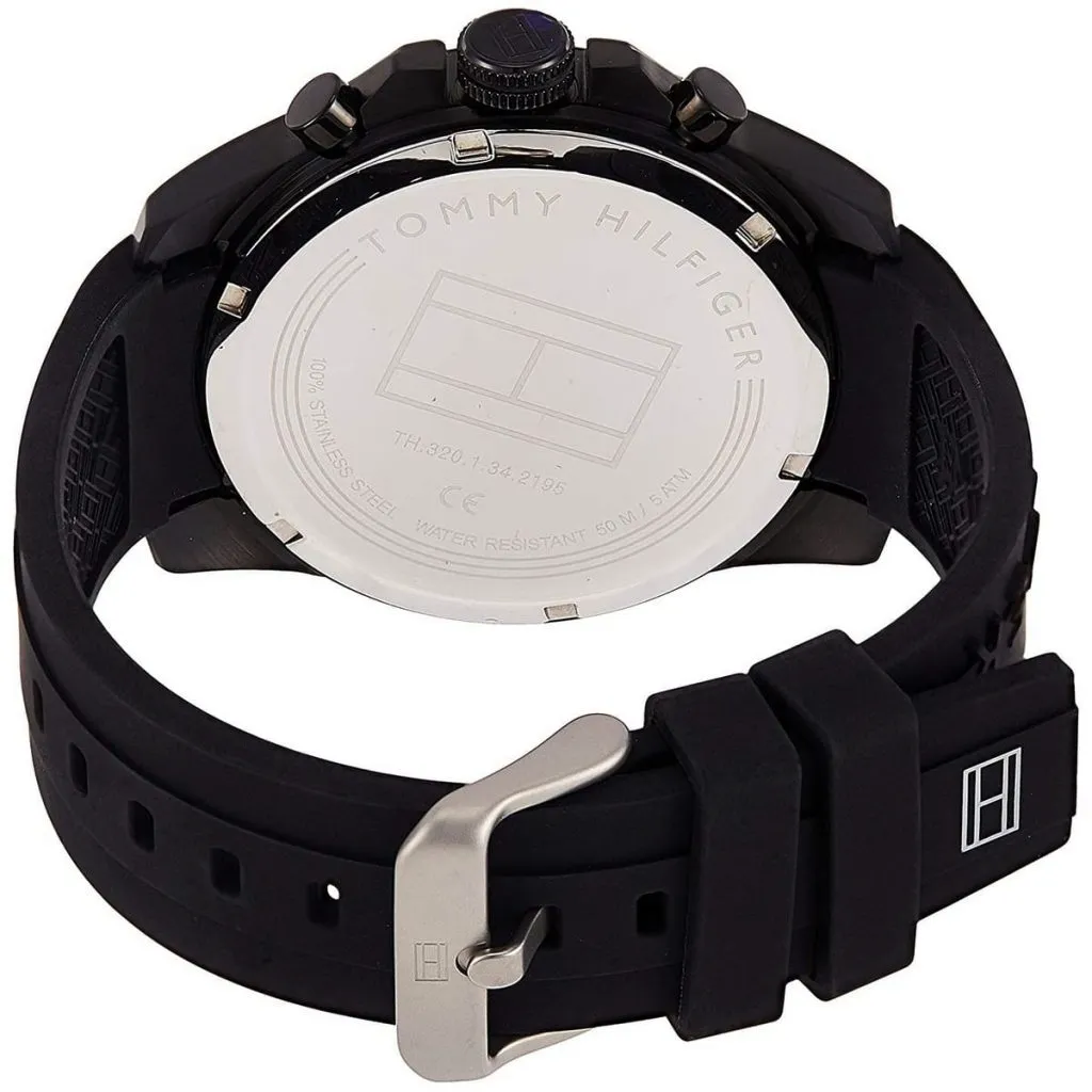 Tommy Hilfiger 1791352 Decker to męski zegarek o nowoczesnym, sportowym wyglądzie. Czarna tarcza została połączona z czarnym paskiem o kauczukowym charakterze oraz kopertą w tym samym odcieniu, co nadaje modelowi spójny i wyrazisty styl.